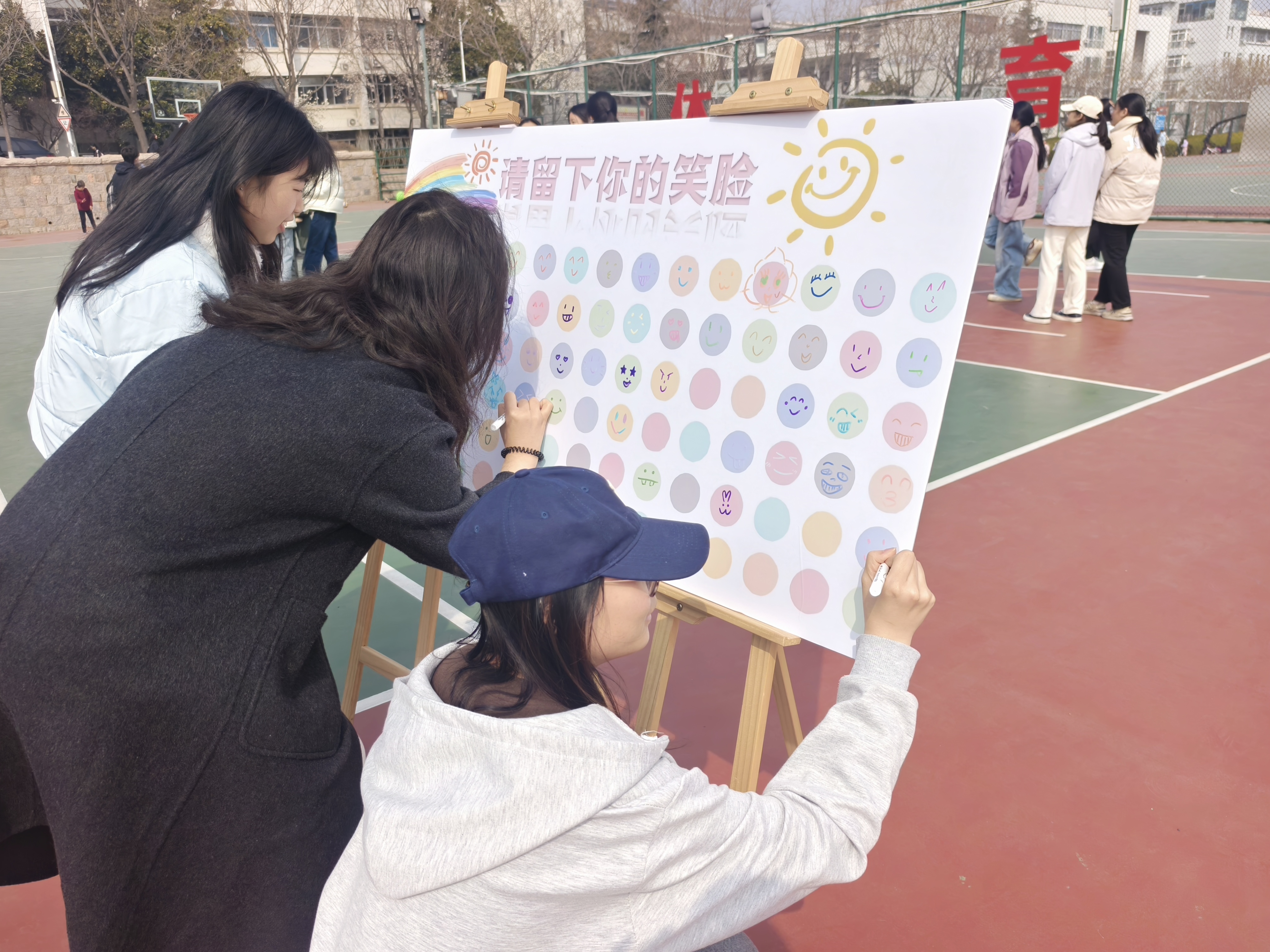 在“共绘笑脸墙”线下互动活动现场,学院设置背景板和多彩画笔。同学们自由发挥创意,在墙上绘制属于自己的专属笑脸,写下简短的正能量词语,记录当下的心情感悟。一张张鲜活的笑脸、一句句温暖的寄语,让原本空白的墙面成为承载青春美好、传递心灵温暖的温情阵地,同学们在创意创作中释放情绪、交流心声,感受彼此陪伴的温暖。