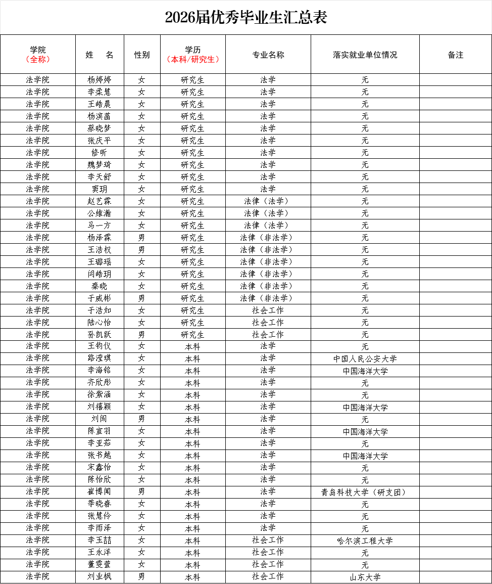 根据学校《关于开展2026届优秀毕业生评选工作的通知》的要求,经个人申请、资格审查,拟确定2026届优秀毕业生人员名单,现予以公示,公示期3个工作日。公示时间:2025年12月15日-2025年12月18日。