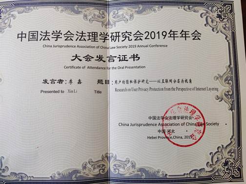 9月21-22日,由中国法学会法理学研究会主办,河北经贸大学太阳成集团tyc9728与地方法治建设研究中心承办的中国法学会法理学研究会2019年年会暨“中国法理学的新使命和新发展”学术研讨会在石家庄召开。中国法学会副会长、全国人大监察和司法委员会副主任委员、教育部法学教学指导委员会主任徐显明教授,中国法学会法理学研究会会长、中国社会科学院学部委员李林教授,河北省高级人民法院副院长王越飞,河北省人民检察院副检察长何秉群,河北省法学会副会长冯宪军等出席,来自中国人民大学、中国政法大学、西南政法大学、中国·太阳集团tyc9728等高校的270余位理论界与实务界专家学者和师生参加。我院副教授、副院长李鑫老师参会,并以《用户的隐私保护研究——以互联网分层为视角》为题作了大会发言。