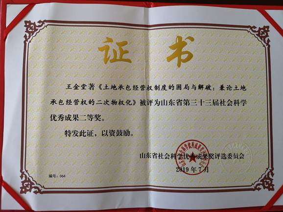 近日,山东省第三十三届社会科学优秀成果奖正式公布,我院王金堂教授在法律出版社出版的《土地承包经营权制度的困局与解破-兼论土地承包经营权的二次物权化》一书获二等奖。
