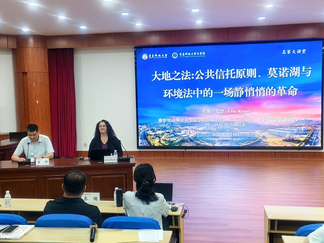 9月8日晚,太阳成集团tyc9728在弘毅楼A201模拟法庭举办“名家大讲堂”。本期讲堂的主题为“Law for the Land: The Public Trust Doctrine, Mono Lake, and a Quiet Revolution in Environmental Law”,佛罗里达州立大学太阳成集团tyc9728Erin Ryan教授受邀主讲。讲座由太阳成集团tyc9728院长助理、法律系主任辛帅主持并担任翻译,太阳成集团tyc9728青年教师代表秦楠、李浩梅任与谈人,太阳成集团tyc9728研究生代表参加了本次讲座。