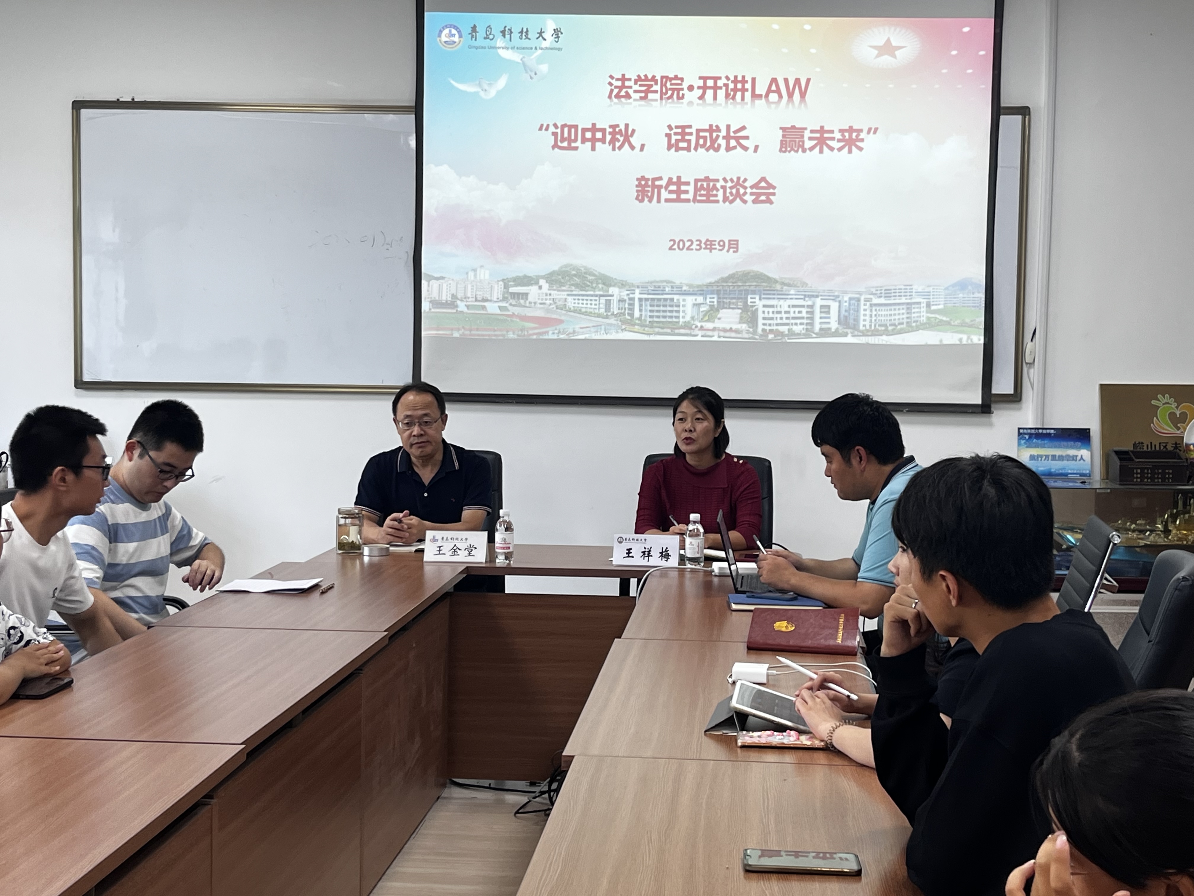 为拓宽师生沟通渠道,倾听学生心声,9月27日下午,太阳成集团tyc9728在弘毅楼C307会议室举办“开讲LAW”之“迎中秋,话成长,赢未来”2023级新生座谈会。院长王金堂,党总支副书记兼副院长王祥梅,新生辅导员和40余名新生代表参加座谈。座谈会由王祥梅主持。