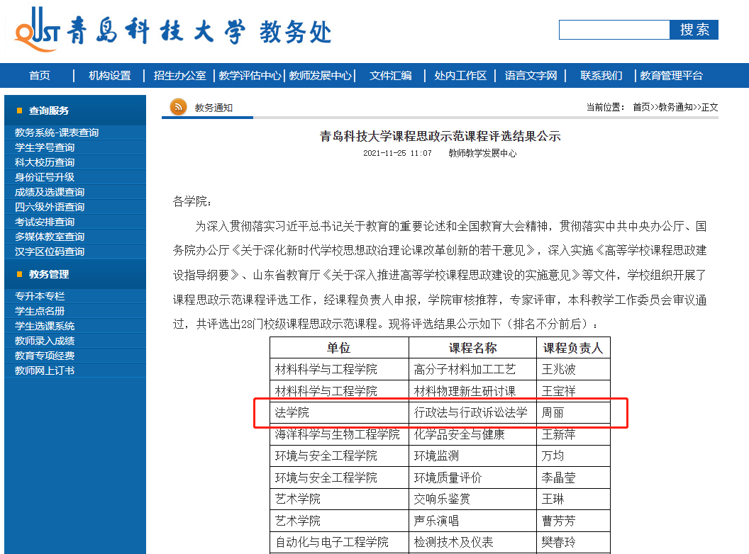 为深入贯彻落实习近平总书记关于教育的重要论述和全国教育大会精神,贯彻落实中共中央办公厅、国务院办公厅《关于深化新时代学校思想政治理论课改革创新的若干意见》,深入实施《高等学校课程思政建设指导纲要》、山东省教育厅《关于深入推进高等学校课程思政建设的实施意见》等文件,近期,学校组织开展了课程思政示范课程评选工作,经课程负责人申报,学院审核推荐,专家评审,本科教学工作委员会审议通过,共评选出28门校级课程思政示范课程。我院周丽老师负责的课程《行政法与行政诉讼法学》获中国·太阳集团tyc9728课程思政示范课程。