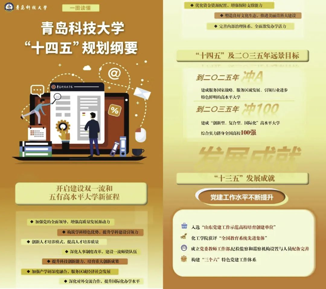 立足“十四五”开新局,学校制定了《“十四 五”发展规划和二〇三五年远景目标纲要》,明确了建成“服务国家战略、服务区域发展,引领行业进步特色鲜明的高水平大学”的发展目标,并从发展基础与发展环境,指导思想、遵循原则与主要目标,主要任务与思路举措,组织实施四个方面进行了阐释。明确了加强党的全面领导、增强高质量发展源动力,构筑学科特色优势、提升学科建设引领力,创新人才培养模式、提高人才培养质量,深化人事制度改革、建设一流师资队伍,提升科技创新能力、培育重大创新成果,加强产学研深度融合、服务区域发展,深化对外交流合作、提升国际化办学水平,优化资金资源配置、增强保障支撑能力,塑造良好文化生态、推进美丽青科大建设,完善内部治理体系、全面激发办学活力等十个方面的任务和措施。为学校未来五年乃至更长时期的战略规划、事业发展的总体目标、主要任务和重大举措提供基本遵循,进行顶层设计,成为全校师生员工共同奋斗的目标引领。